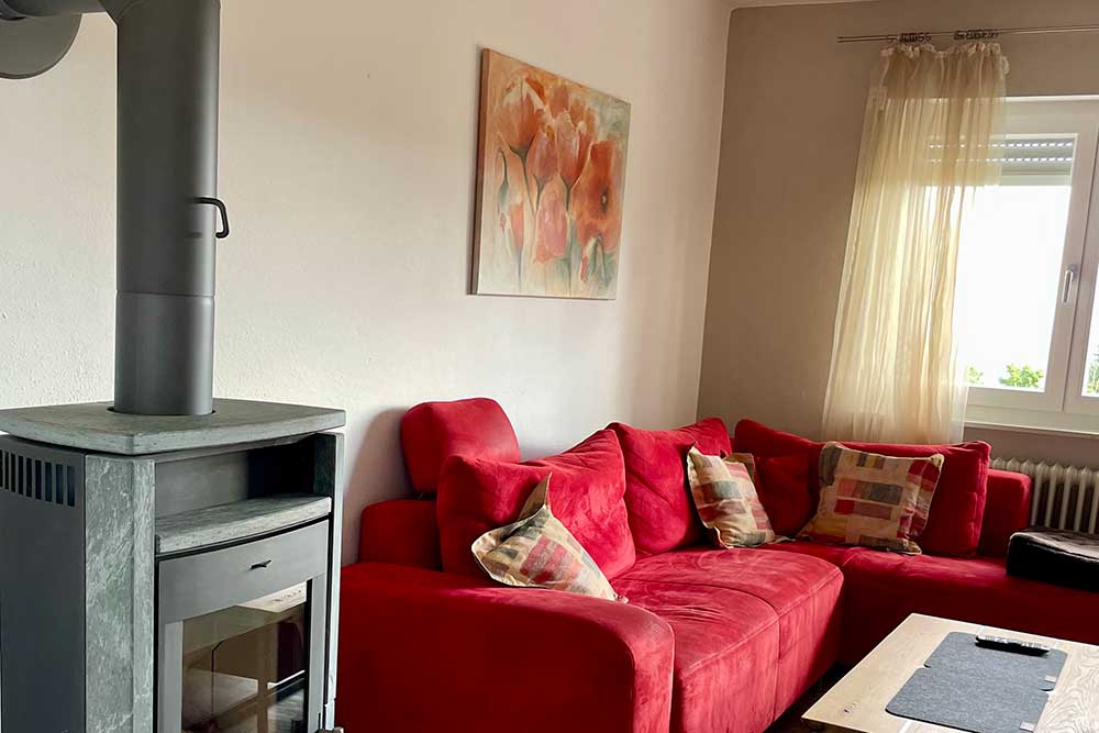 - Wohnzimmer mit Flach-TV, gemütlichem Holzofen und Südbalkon.